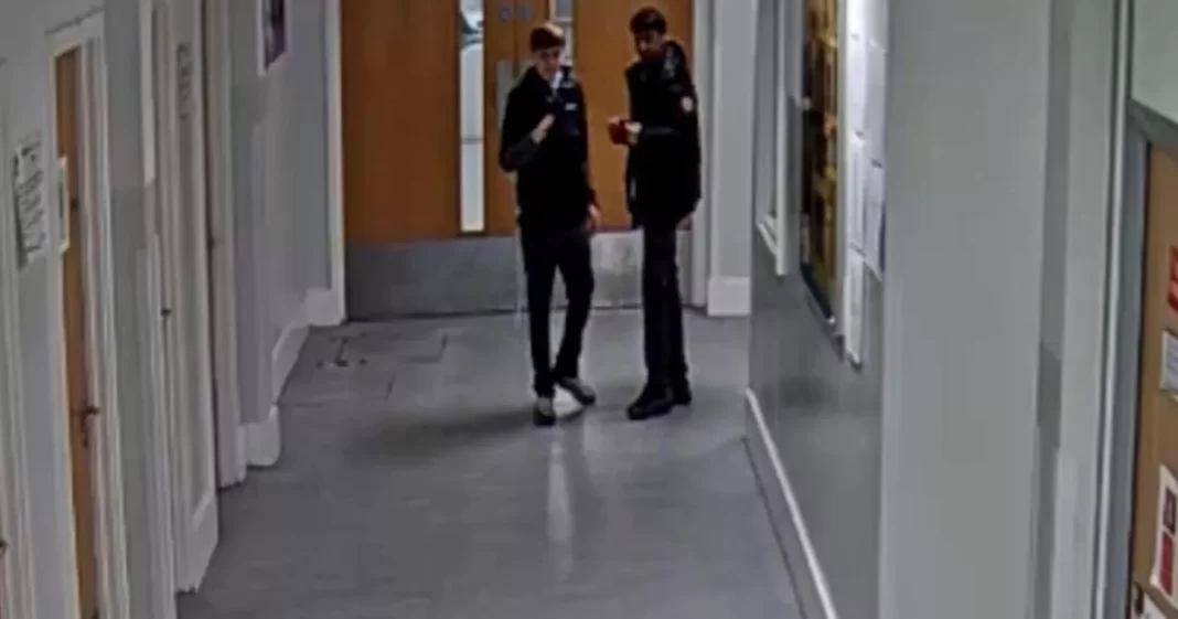 In disturbing footage released by police, both lads are captured arriving at the school on the morning of the killing. The pair, who had clashed on social media, are then filmed alone together in the school hallway.