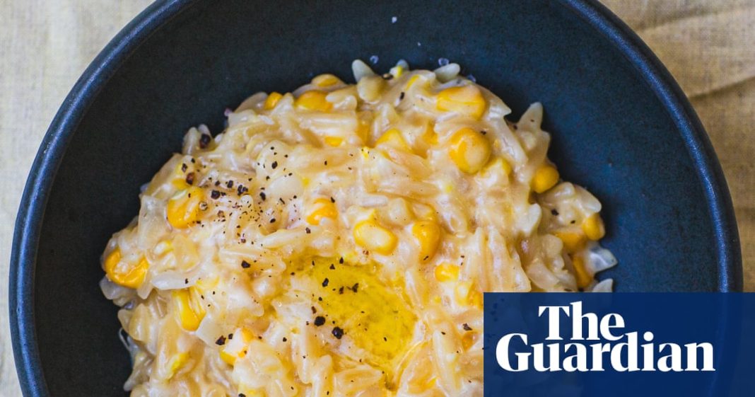 This dish was a happy accident, and left me and my family drooling for more. I was planning a classic tomato orzo to use up that half-bag in the cupboard left over from making a pasta salad, but wanted something more seasonal. Fresh corn cobs are one of autumn’s fleeting treats, as short-lived as asparagus, and during their brief season I eat them weekly. In the spirit of this column, I thought it would be good to use the whole cob – not just the sweet kernels, but also the starchy, flavourful pulp and the spent cobs. That extra flavour, combined with a parmesan rind, onion, butter and a splash of cream or water, turns a single cob into a generous and deeply satisfying dish for two.