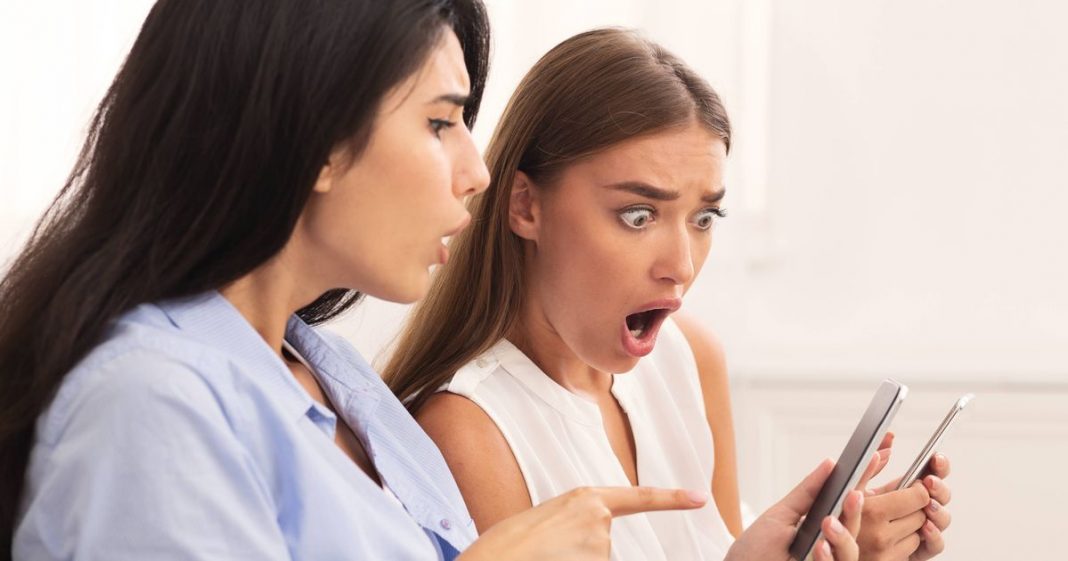 Shocked Girls Pointing Finger At Phone Reading Messages Or News Sitting On Couch At Home.