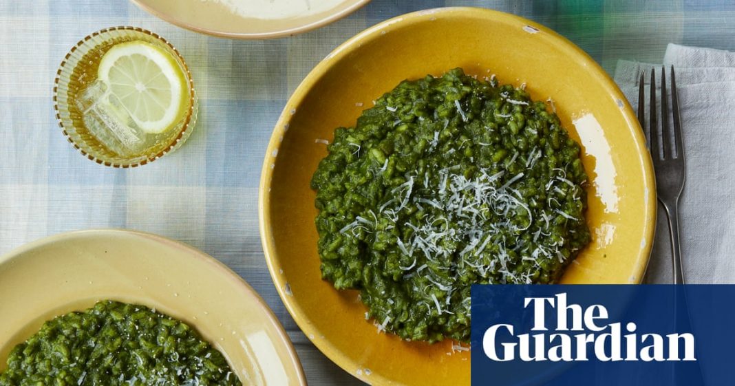 When the rice is ready, stir in the green puree, cook, stirring, for a further two to three minutes, then take off the heat, cover and leave to rest for two minutes.