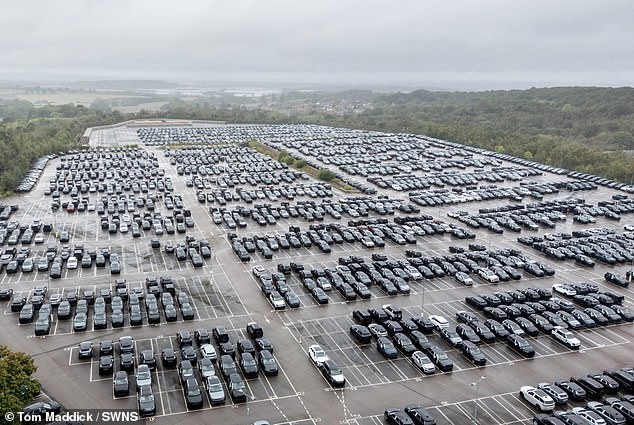 Small firms that supply Jaguar Land Rover (JLR) on Thursday night warned they are a week away from collapse. Pictured, hundreds of vehicles at Jaguar Land Rover’s National Distribution Centre in Warwickshire
