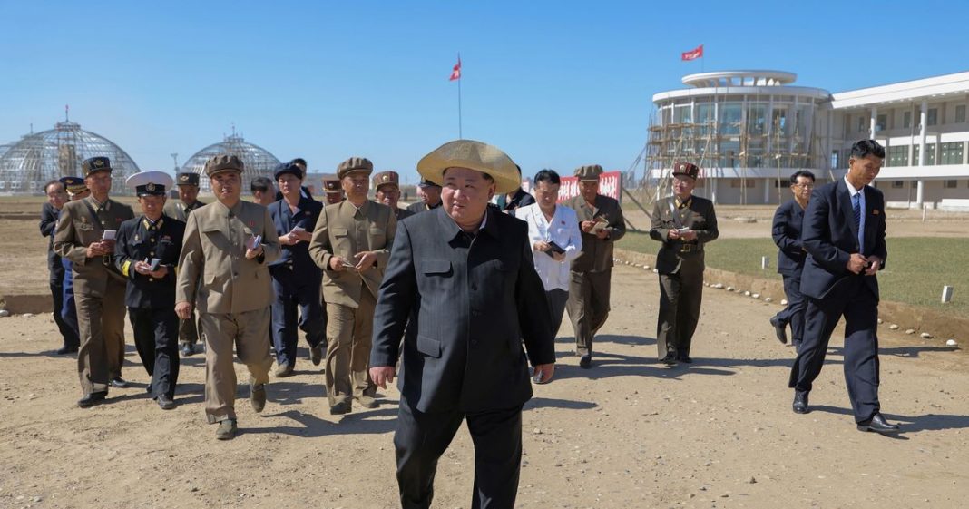 Kim Jong-un showed off his bold fashion sense while touring Sinuiju Combined Greenhouse Farm earlier this week by donning a straw beach hat and his regular black Mao suit.