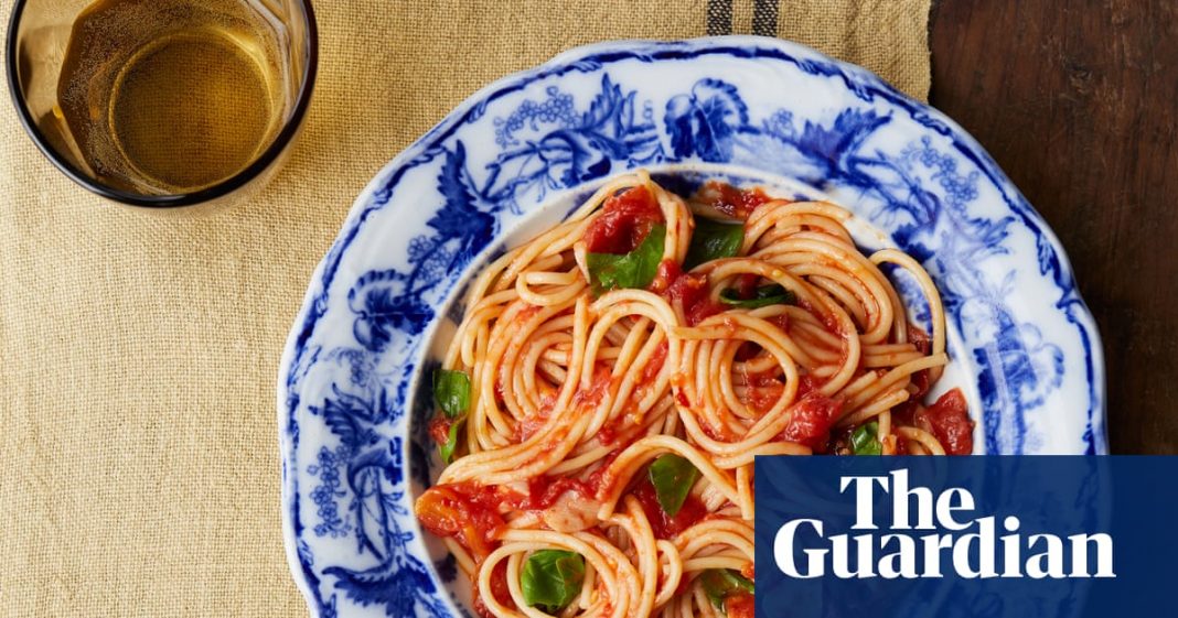 The first of these speedy, coat-on favourites is spaghetti with a quick tomato, garlic and chilli sauce. It is described by a Neapolitan friend as a mix between a quick tomato sauce (AKA sciue sciue, pronounced “shway shway” and meaning “hurry hurry’’) and that store-cupboard saviour spaghetti with garlic, chilli and olive oil (aglio, olio e peperoncino, or AOP). Like spaghetti AOP, spaghetti with quick tomato, garlic and chilli sauce is not so much a sauce but a flavourful and fast coating for the thin strings of pasta. It is also a condiment in which the olive oil plays a fundamental role, so use the best you have, and don’t skimp.