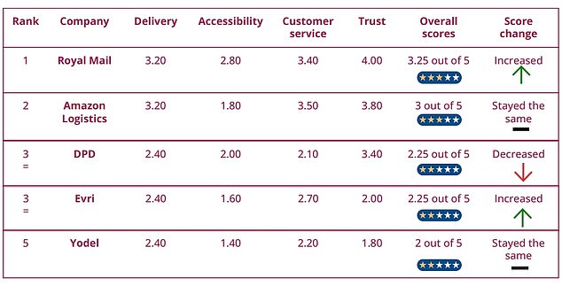 Yodel, Evri and DPD are the worst performers, with a score of 2.4, while Royal Mail and Amazon Logistics scored 3.2 out of 5.
