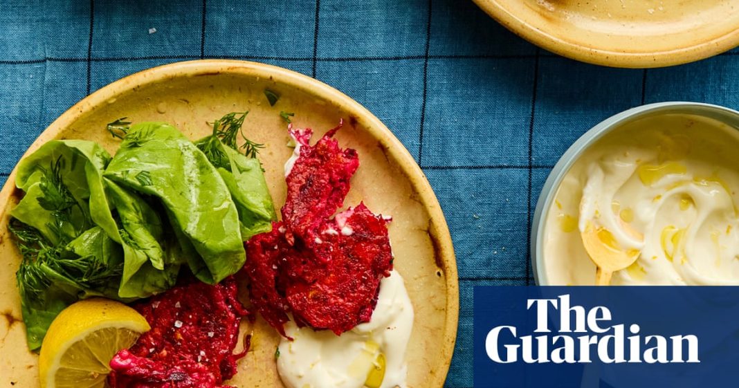Grate the apples skin and all into a clean tea towel, then twist and squeeze the towel over the sink to remove as much moisture as you can. Tip the grated apple into a large bowl, then add the grated beetroot, egg and crumbled feta, and mix well. Scatter in the flour and mix again.