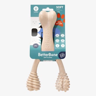 Over the years, we have used various forms of hard chews for our dogs, but we’ve never felt great about the plastic used in the most popular ones. Instead, we started Koopa off with BetterBone chews, which are made of cellulose fiber. This plant-based material is easier on both his teeth and the environment.