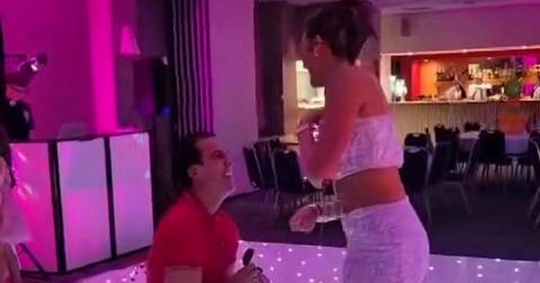 In the video, Noah is seen in a red polo shirt while birthday girl Venezuela dons a white sparkly crop top and matching skirt. The pair share a laugh on the dance floor before Noah drops to one knee and presents a ring box to an astonished Venezuela.