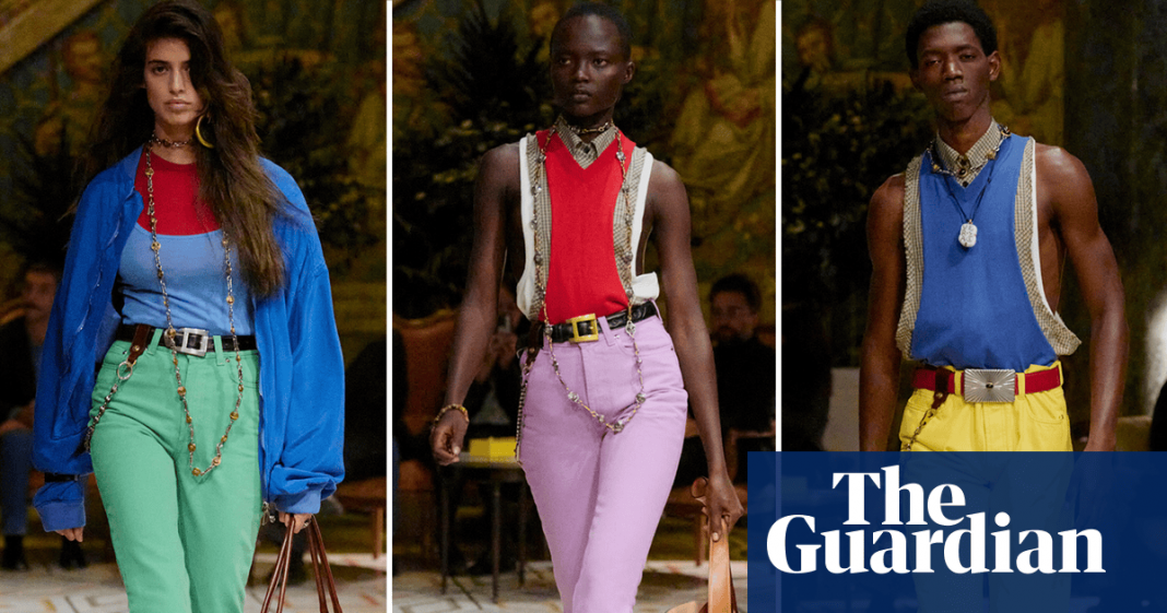 The collection included denim left unbelted at the waist and unbuttoned shirts. Photograph: Versace