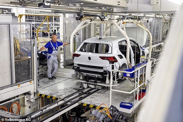 On Wednesday, Volkswagen told workers at other plants in Germany t hat it cannot rule out assembly line stoppages due to the ‘dynamic situation’. Wolfsburg Golf assembly line pictured